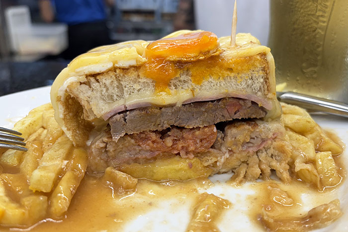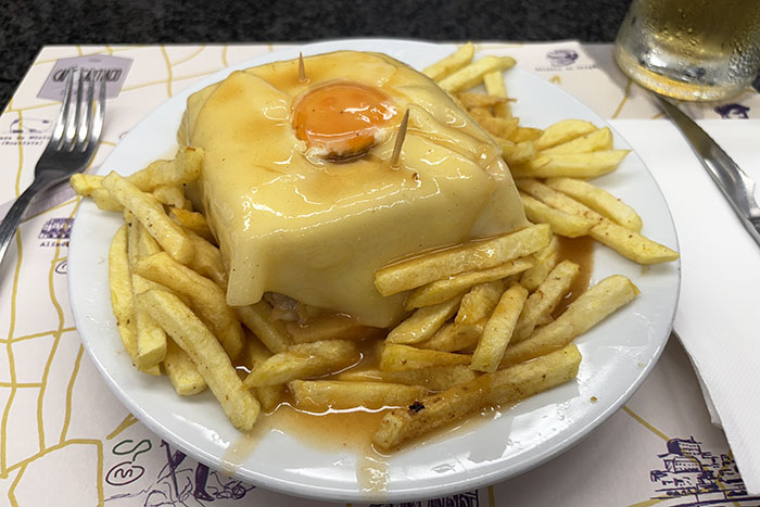 ステーキ、ハム、ポルトガルソーセージを挟んだサンドイッチにとろけるチーズとたまご乗せてグレービーかけてフライドポテトもりもりにしたやつです。