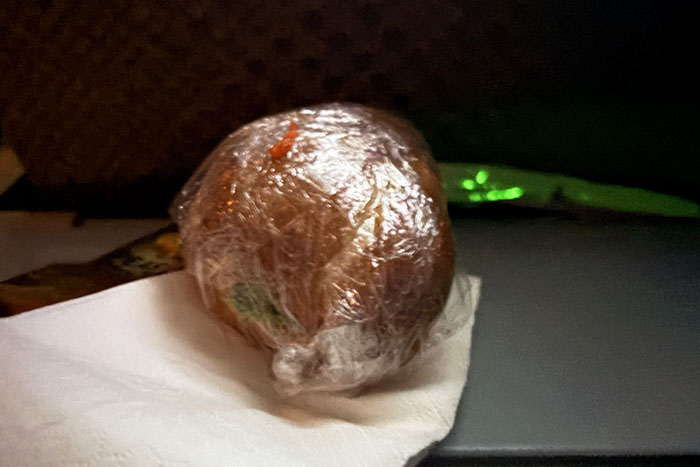 離陸から5~6時間経った頃かな、何か小腹が空いて、長距離便でオープンしてるスナックバー?っていうんだっけ?パントリーにサンドイッチやスナック等が置いてあるとこに行って小さなバゲットサンドをもらってきた。